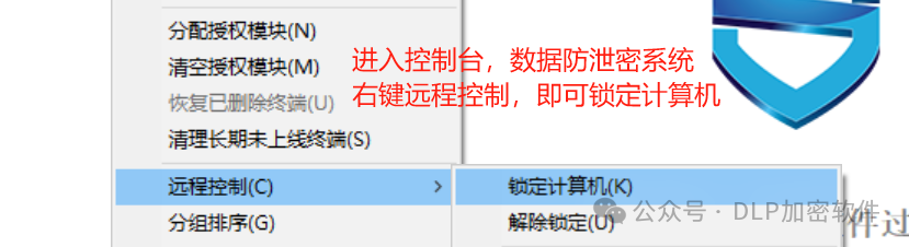 等了天锐绿盾控制台,进到数据防泄密系统,找到指定终端,右键远程控制,锁定计算机。